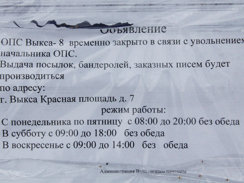 – ОПС №8 действительно временно не функционирует. Причина в кадровом голоде, имеющем место на Выксунском поч-тамте. Нагрузка и ответственность у работников почты очень большая, чего нельзя сказать об их зарплате, вот люди и уходят на более высокооплачиваемые должности.