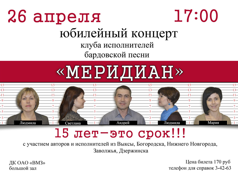 26 апреля во Дворце металлургов состоится юбилейный концерт клуба исполнителей бардовской песни «Меридиан». На вечернее выступление придут не только друзья и поклонники этой группы, но и такие же авторы и исполнители из других городов (Богородска, Нижнего Новгорода, Заволжья, Дзержинска). Большой зал ДК наполнится единомышленниками, влюблёнными в творчество выксунских бардов, а со сцены традиционно зазвучит «…надежды маленький оркестрик под управлением любви…»