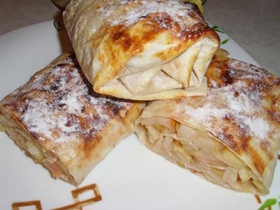 Более сложен, но своеобразен по вкусу яблочный штрудель